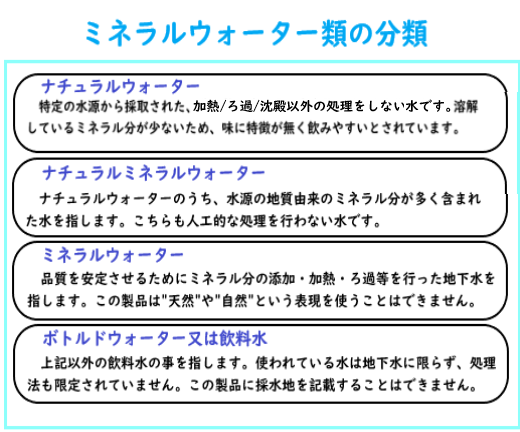 食品衛生法の中で、ミネラルウォーターとは、 “水のみを原材料とする清涼飲料水”のことを言います。ミネラルウォーター類は、「ナチュラルウォーター」「ナチュラルミネラルウォーター」「ミネラルウォーター」「ボトルドウォーターまたは飲料水」の4種類に分けられます。
