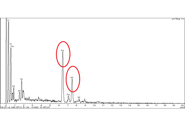 鉄とニッケルが検出されました!!ニッケル含有量は計算値として20~30%であり、人工の鉄とニッケルの合金と比較してニッケルが多く含まれていました。